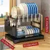Two-tier rack design: top section for cups/mugs/glasses, lower section for plates, bowls, pans.